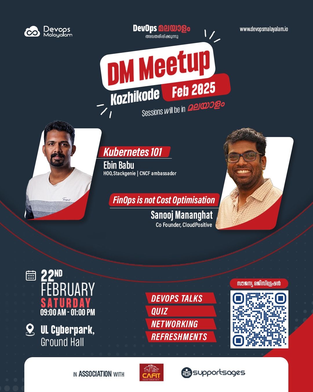 Thank you for the overwhelming love and support from Kozhikode! Our first-ever DevOps Malayalam Meetup in the city, held on Saturday, February 22nd at UL CyberPark, was a huge success with 94 enthusiastic participants bringing incredible energy. A big thank you to our sponsors, Calicut Forum of Information Technology (CAFIT) and SupportSages Consultancy Services Pvt Ltd, for their invaluable support. The event featured insightful sessions—Kubernetes 101 by Ebin Babu (CNCF Ambassador, HOO - Stackgenie) and FinOps is not Cost Optimisation by Sanooj Mananghat (Co-Founder, CloudPositive)—plus an engaging quiz by Anas K. Special thanks to Muhammed Iqbal P B, Shaheer Khan, and all the organizers for their dedication. The community deeply appreciates the tireless efforts of our operations team, whose seamless coordination made the event a smooth and memorable experience. We're excited for future meetups and continued collaboration in Kozhikode and beyond!