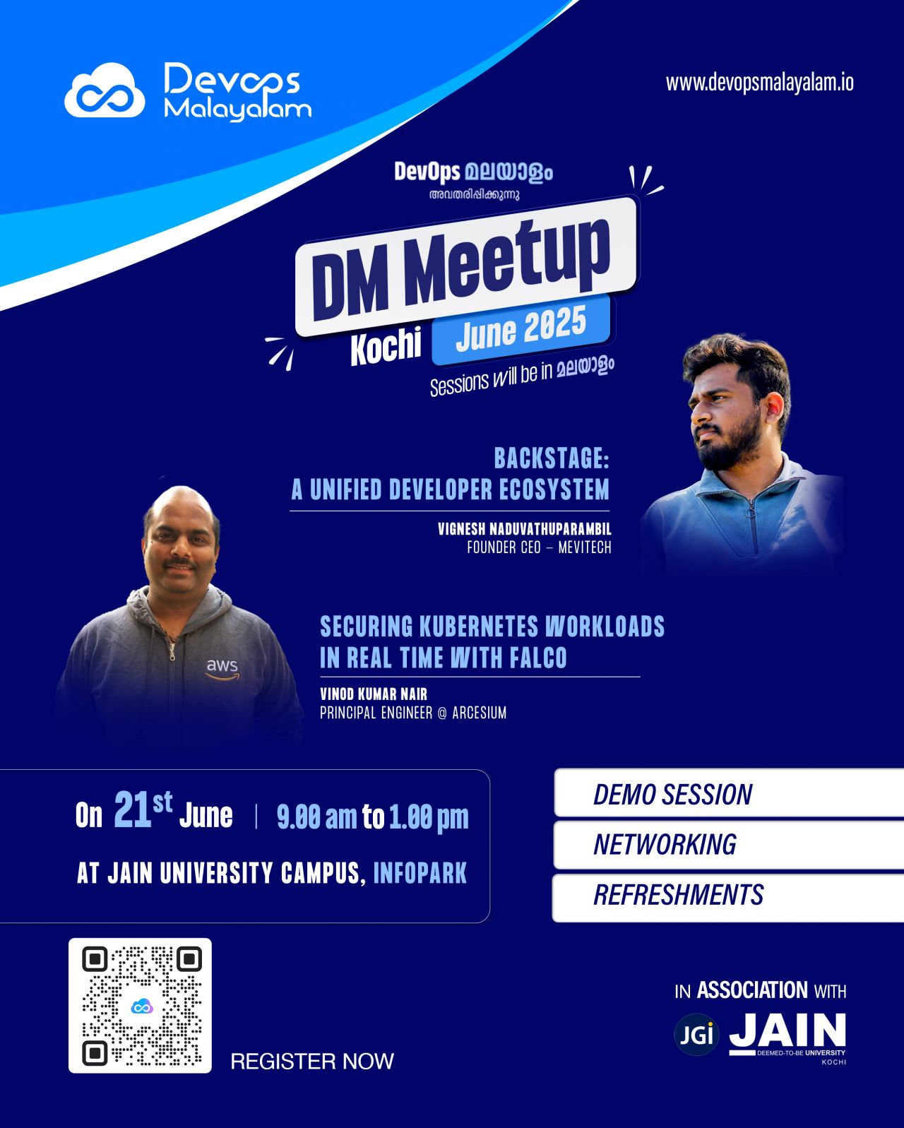 The June edition of the DevOps Malayalam Meetup, held on June 21st at Jain University Kochi, Infopark, was an electrifying success! With an energetic audience and powerful sessions, the event showcased insightful talks by Vignesh Naduvathuparambil (Founder & CEO, MeviTech) on the Unified Developer Ecosystem Framework, and Vinod Kumar Nair on Securing Kubernetes Workloads in Real Time with Falco. Huge thanks to Jain University Kochi for their warm hospitality, and to Dr. Felix M Philip, Bindhu Menon, and Srikanth for their constant support. We’re especially grateful to our event sponsor, Vividhut, for capturing the event’s magic through stunning visuals. A heartfelt shoutout to the organizing team whose efforts made this event possible. As we gear up for our flagship event #DMCON 2025 in Kochi, we invite passionate DevOps enthusiasts to join us and be part of our growing community. Let’s keep building, sharing, and growing—together!