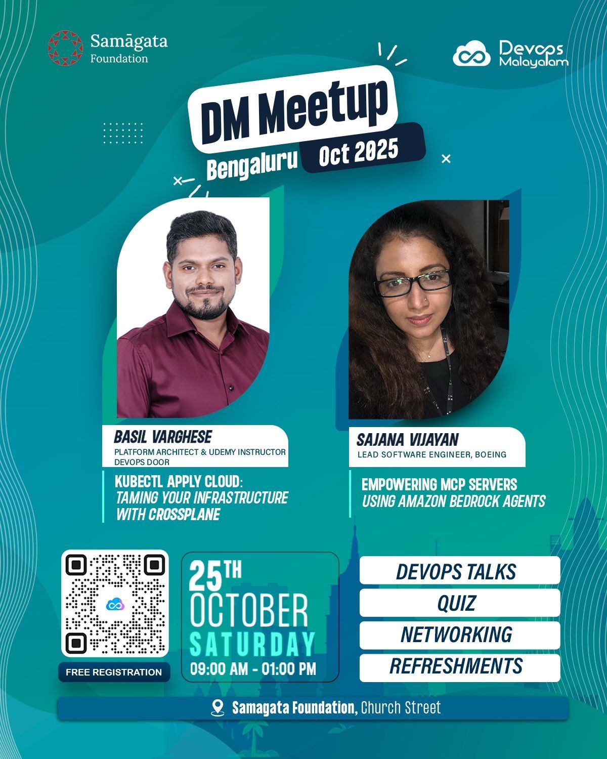The first-ever DevOps Malayalam Meetup in Bengaluru, held on 25th October 2025 at Samagata Foundation, Church Street, marked an incredible beginning for the community in Namma Bengaluru. The event brought together professionals, learners, and DevOps enthusiasts for a morning filled with learning, networking, and collaboration. The meetup featured two engaging sessions: “Empowering MCP Servers with Amazon Bedrock Agents” by Sajana Vijayan, Lead Software Engineer at Boeing, which offered insights into building intelligent, agent-driven cloud solutions, and “Kubectl Apply Cloud — Taming Your Infrastructure with Crossplane” by Basil Varghese, Platform Architect and Udemy Instructor, who shared a practical approach to managing cloud infrastructure declaratively. The vibrant discussions were complemented by an exciting DevOps quiz, adding fun and interaction to the event. A heartfelt thanks to Samagata Foundation for hosting and MakeMyPass for supporting a seamless experience, along with all speakers, organizers, and attendees who made this meetup truly memorable.
